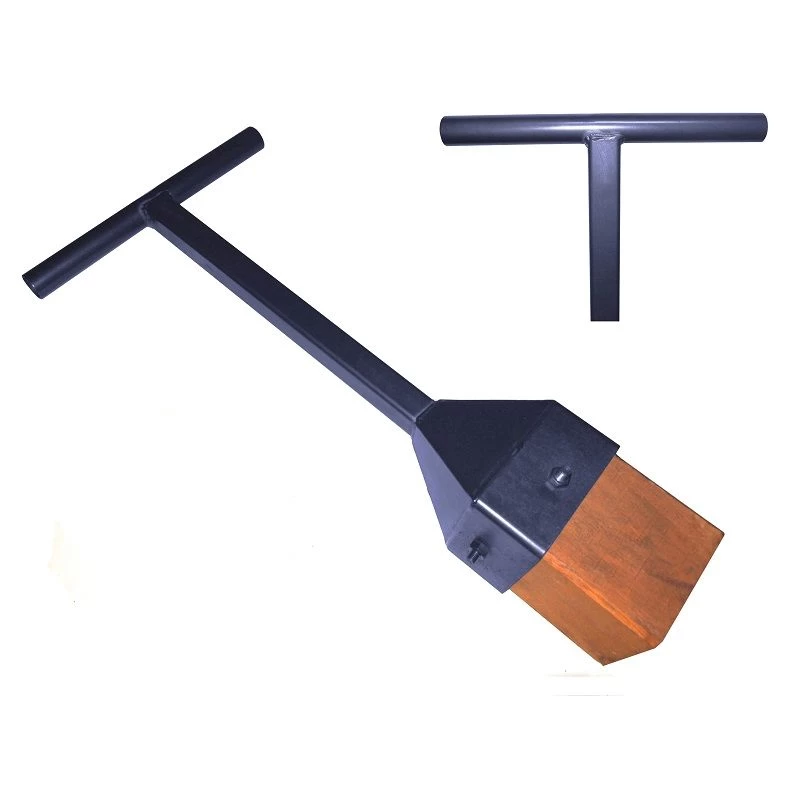 Stamper voor het aanstampen van grond, voorzien van een sterke houten klos die vervangbaar is. Lengte 84 cm.