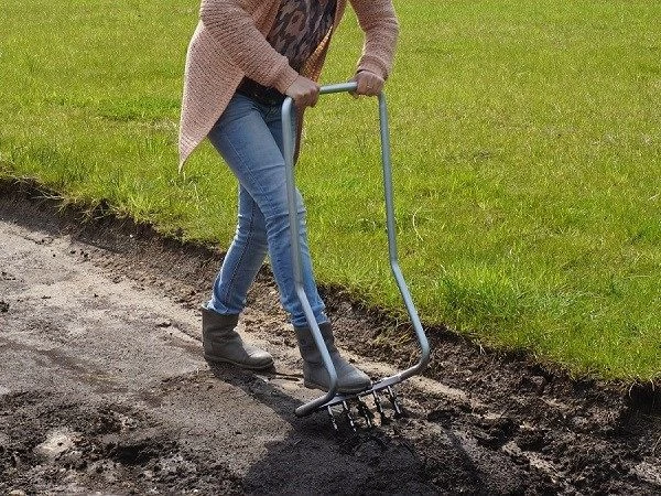 Een gazon- of grondbeluchter / gazonprikker. Een professionele uitvoering van De Wit met 5 stalen pennen met een doorsnede van 10 mm
