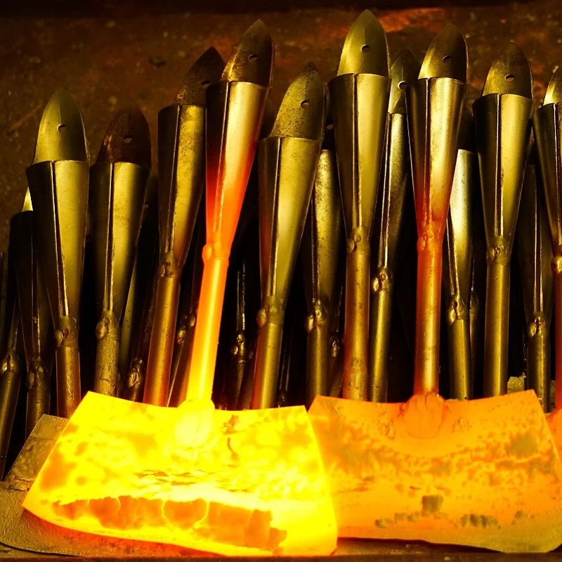 Compleet met een zware schoffelsteel met doorgestoken hilt. Stevige montage met slotbout door dul en steel
