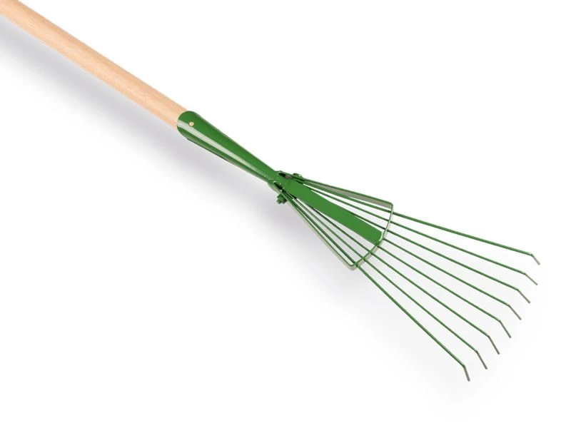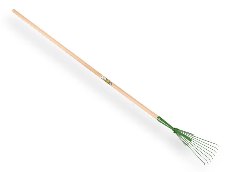 Een professionele bladhark met 8 ronde verenstalen tanden met extra stabiliteit vanwege de 3 mm dikte van de buitenste tanden. Compleet geleverd met steel.