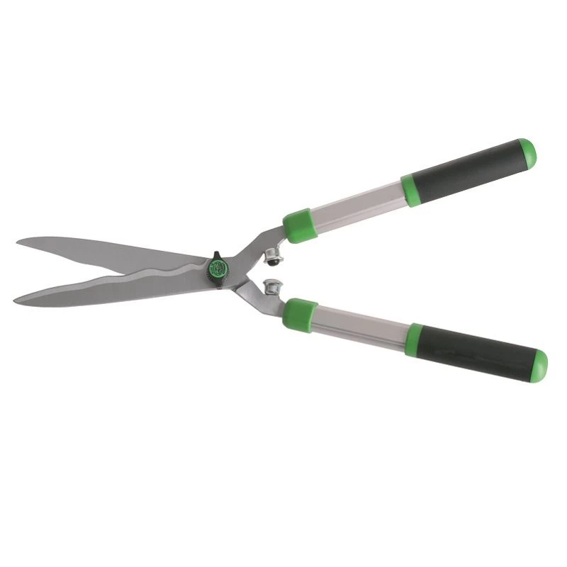 Een gesmede heggenschaar met aluminium buizen, met geharde golfsnede.