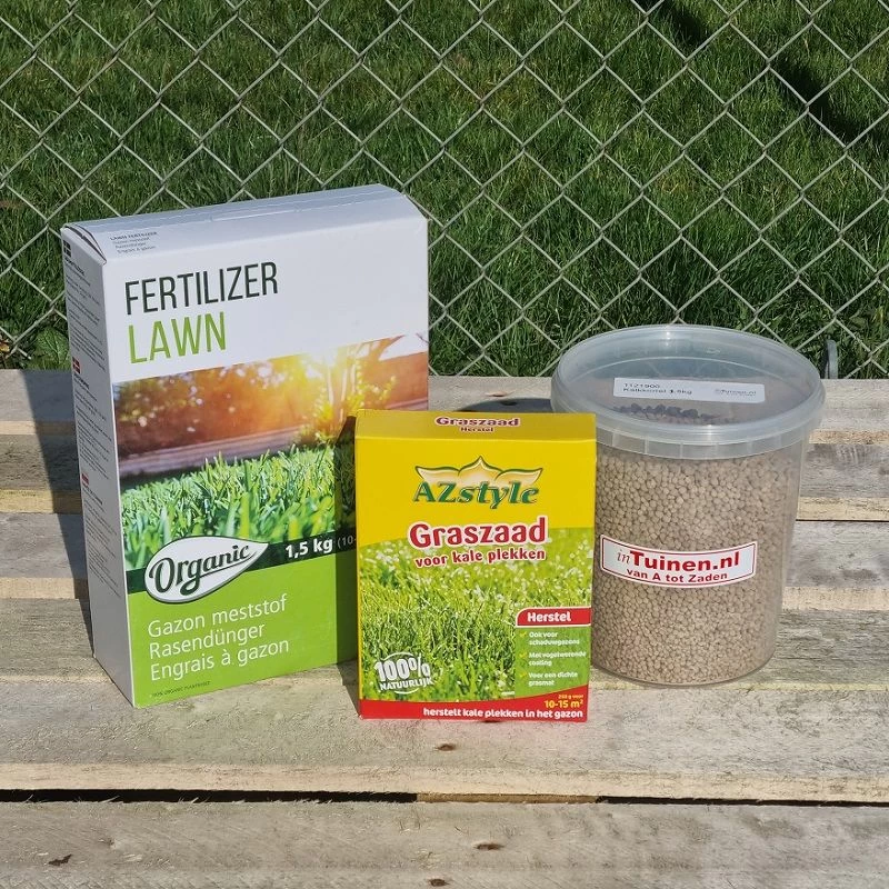Een compleet pakket voor uw gazon. Met een gazonmeststof, kalk korrel en graszaad.