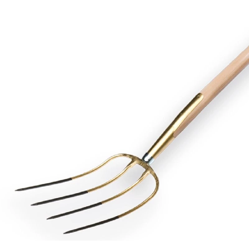 Een professionele bronzen Mestvork 4-tands met een pen / dop verbinding. Compleet met een extra lange essen houten T-steel van 100 cm